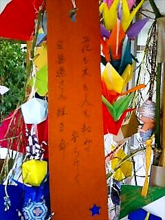 さて今日は養護の入所者、特別養護の入所者、そしてデイサービスにいらっしゃる皆さんのところの計3会場を回ったが、皆さんがジッと聴いて下さっている表情(とか一緒に口ずさんでくれている様子)を一人ひとり拝見しながら、こちらの方がまるっきり癒されてしまった。むむ~何のパワーというのかね、これは。だって今朝なんか「最近、思い通りにいかない事が多いし怒りの日記でも書こうかな」などと予定していたのが、帰ってきたら何をイラついていたのかすら忘れてしまった。心の曇りが晴れ、「素」になったという感じだ。天の川見えたゾって感じだ。「気分」なんてモノは目に見えないし実態すら分からないので扱いに困ったり軽視しがちだが決してあなどれない。日々の思考もあなどれない。嫌なことを考え続けていると自分でも嫌な人間になる。どうせ限られた時間をこの世で過ごすなら、気持ちのいい時間を生きた方がイイに決まっている。こちらの施設にお邪魔するようになってから、私はずいぶん「健康」になった。施設に飾られていた短冊の言葉が印象的だった。