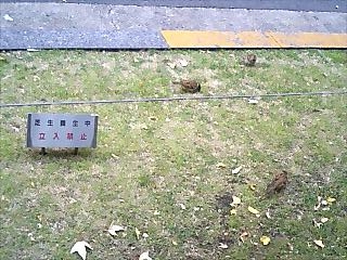 写真は、芝生をむさぼり食うニワトリ、じゃなく雀じゃん。画面の外にも10羽はいた。立入禁止の札も雀には無力。