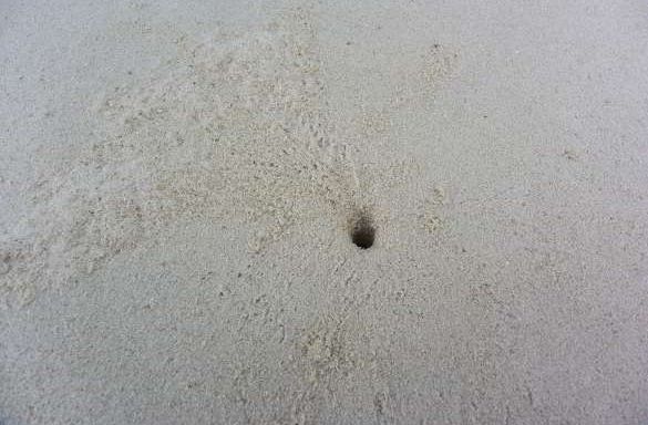 右: 指一本分ぐらいの直径の穴が、砂浜にたくさん。